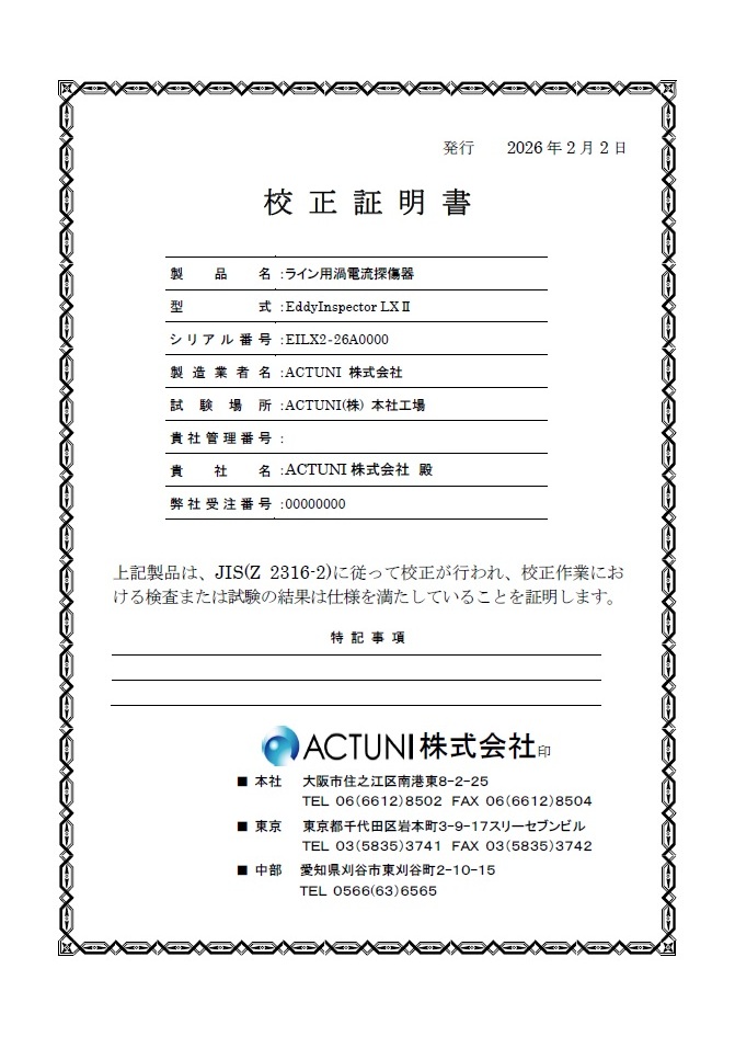 ACTUNIの検査器は、全機種 JIS Z-2316-2に準拠した校正を実施し校正試験成績書と校正証明書を添付しています。校正に使用する機器は専門の機関にて校正を実施しトレサビリティーが取れるようになっています。